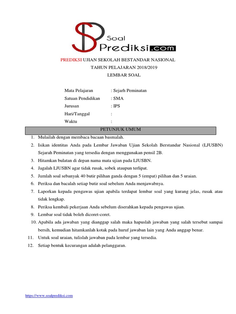 Soal ujian sejarah peminatan kelas 12 sma pdf 2018. Download Bocoran Soal US Sejarah Tahun 2020 PDF Lengkap Matematika Fisika Kimia Biologi Sejarah Geografi Sosiologi Ekonomi PPKn PAI Bahasa Indonesia Inggris PKWu SBK Ujian Sekolah Berstandar Nasional atau USBN tahun 2020 resmi dihapus oleh Kementerian Pendidikan dan Kebudayaan Kemdikbud artinya satuan pendidikan melaksanakan Ujian Satuan Pendidikan USP. Soal ujian akhir sekolah sejarah kelas xii ipa Berikut ini adalah file tentang soal ujian akhir sekolah sejarah kelas xii ipa yang bisa bapakibu unduh secara gratis dengan menekan tombol download pada tautan link di bawah ini.