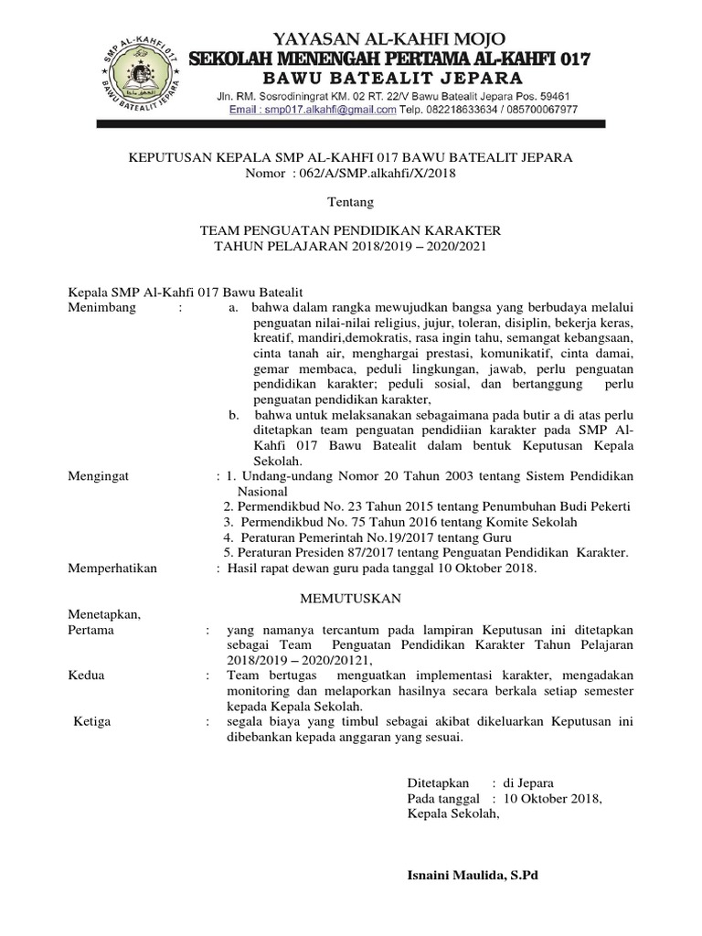 Contoh Sk Tim Penguatan Pendidikan Karakter Doc Terkait Cute766